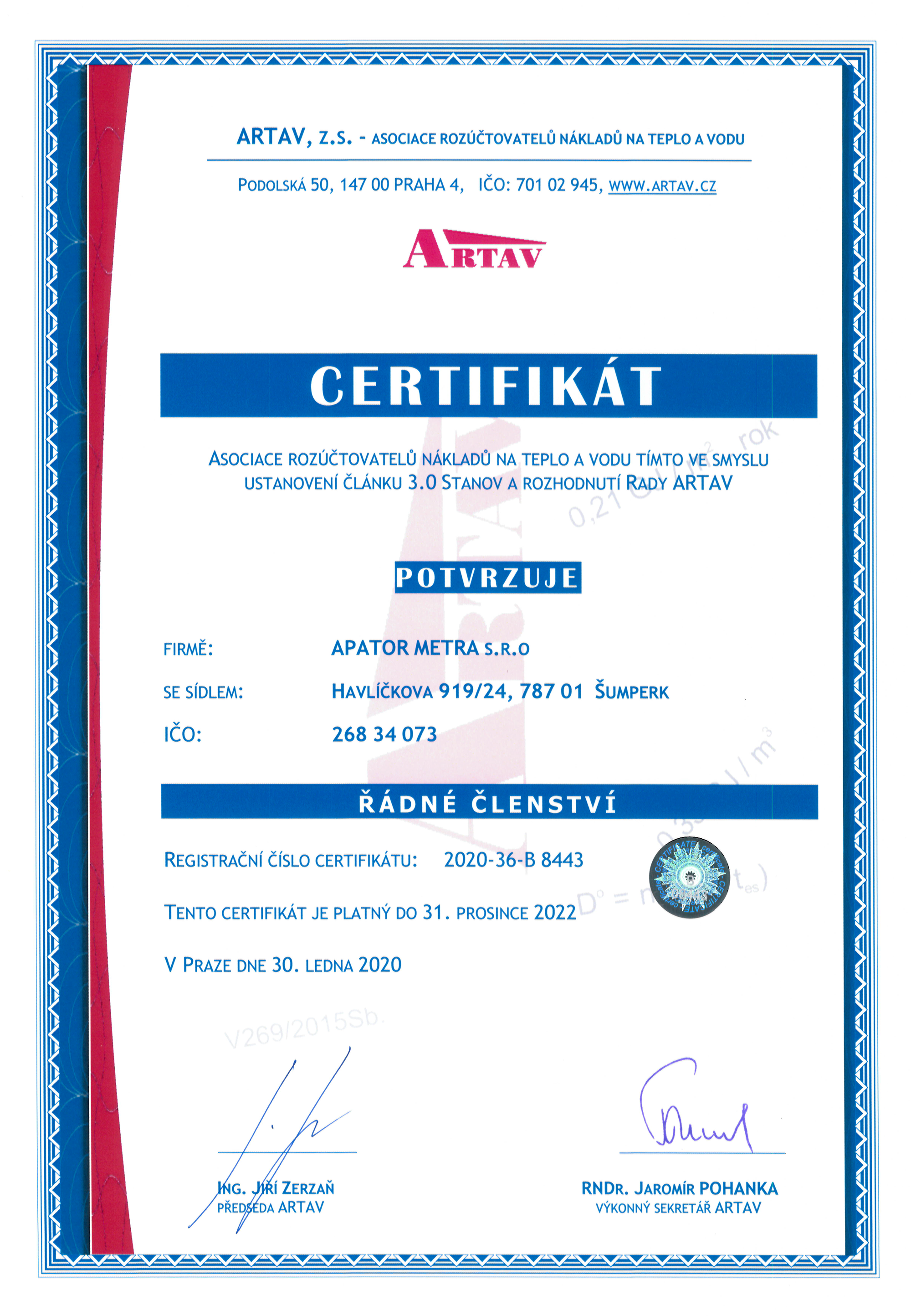 Jsme zakládajícím členem Asociace rozúčtovatelů nákladů na teplo a vodu (ARTAV). Hlavními cíli tohoto neziskového zájmového sdružení je spolupráce se státními orgány na tvorbě legislativy upravující rozúčtování nákladů na teplo a vodu a poskytování odborného poradenství.
